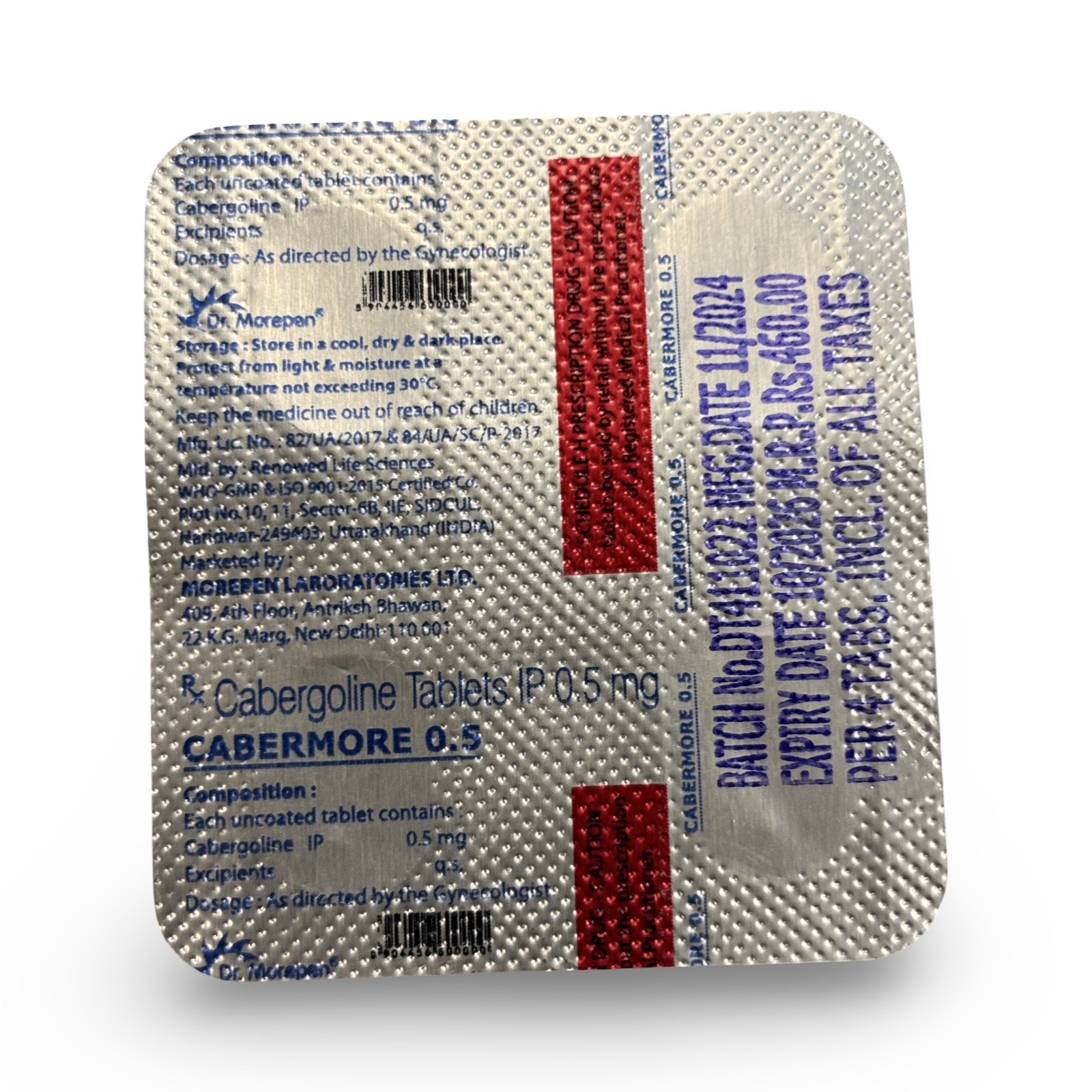 Caberdost Cabergoline .5mg x 4 tablet pharma blister strip imported India Pharmacy ( Quantitative and qualitative analysis second image)