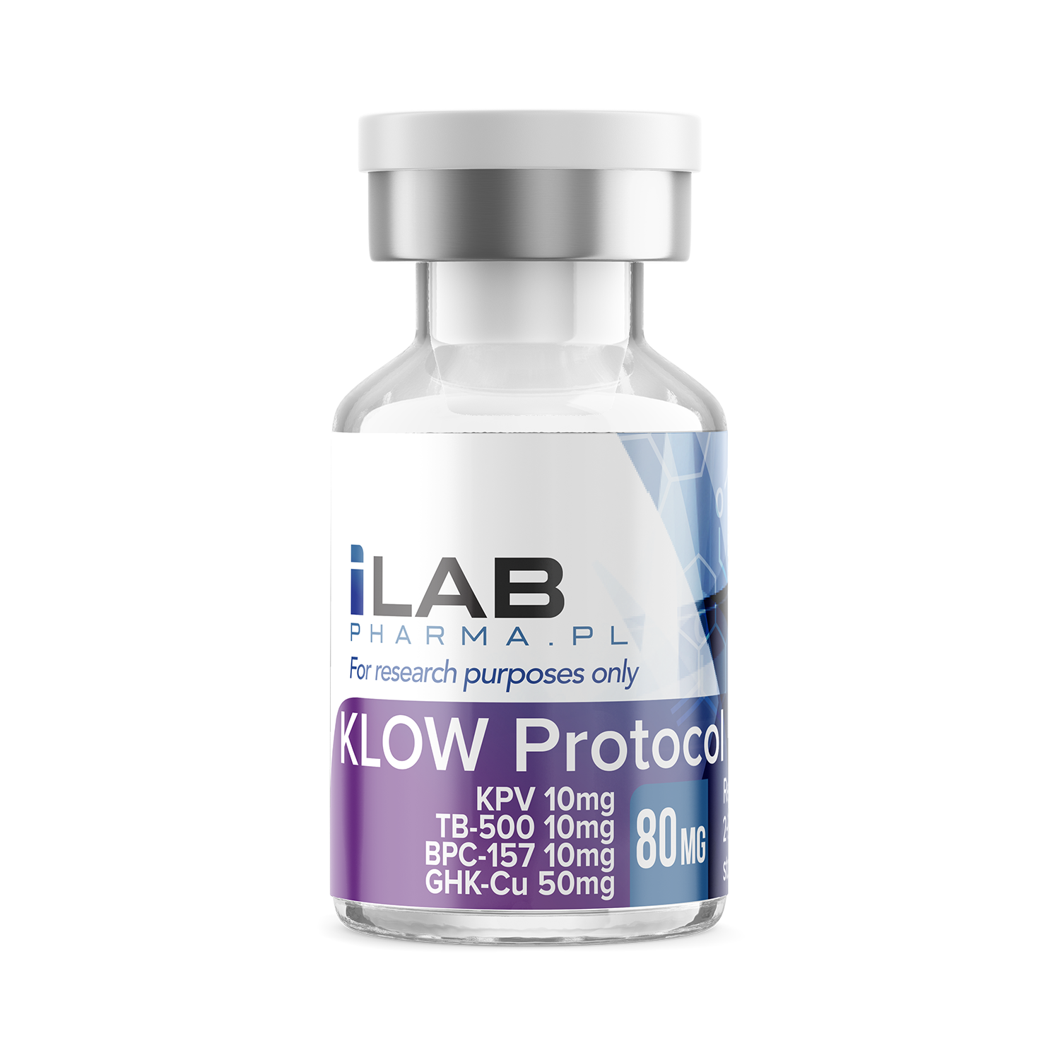 Klow Protocol 80mg is a lyophilized multi-peptide research blend combining BPC-157 (10mg), TB-500 (10mg), KPV (10mg), and GHK-Cu (50mg). Each component plays a unique role, enabling multi-pathway studies into regeneration, anti-inflammatory processes, and structural protein synthesis.