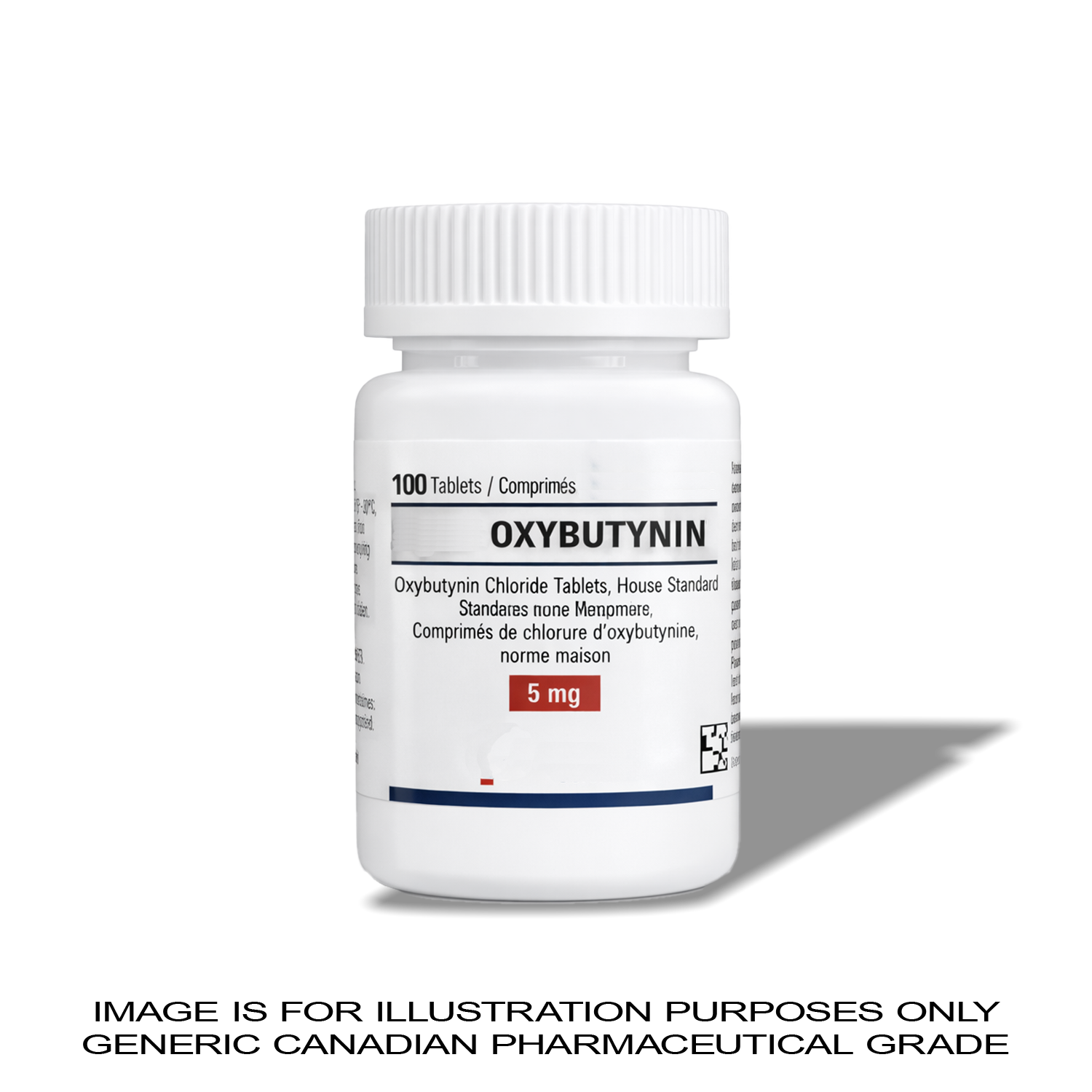 Each bottle contains 100 tablets of 5mg Oxybutynin, securely packaged to maintain stability and integrity. Manufactured to Canadian pharmaceutical-grade standards, it undergoes rigorous third-party testing for identity, purity, and potency.
